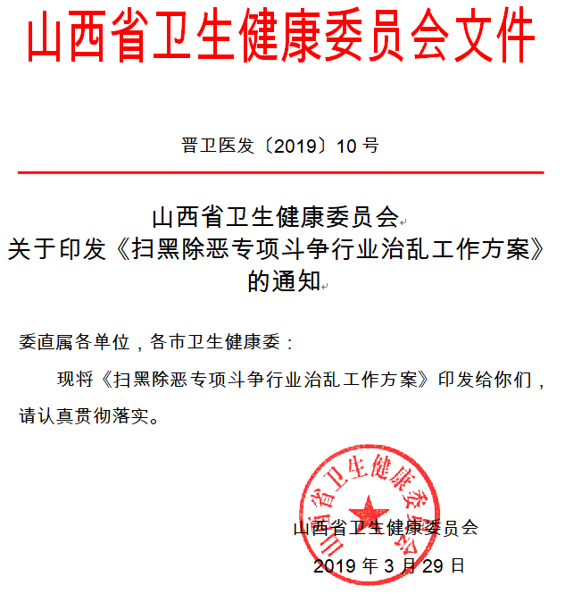 山西省卫生健康委员会关于印发《扫黑除恶专项斗争行业治乱工作方案》的通知(1)