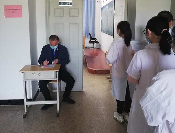 学院李艳彦副院长及科教科李变花主任现场督导巡视,学校督导组也到现场进行了巡考。考核组团队齐心协力,共考核中医实验班,定向班,中医一.二班学生120名,圆满完成此次疫情期间返校毕业生临床技能考核任务!