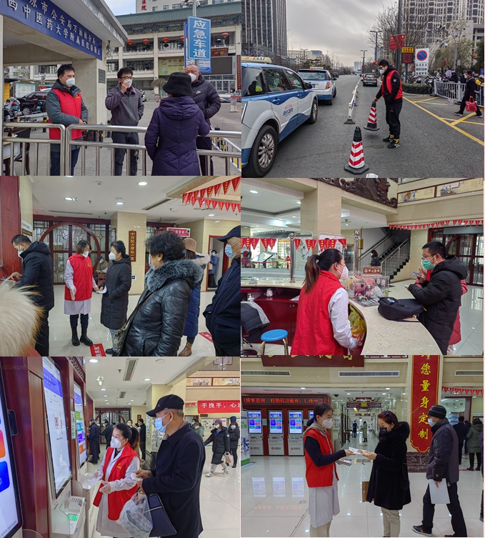 团委志愿者在医院大门口指引就医的患者及车辆做好入院准备。在门诊大厅,积极向患者提供就医服务、按防疫规定维持秩序,向患者开展防疫宣传、安全保障等服务,缓解防疫工作压力。