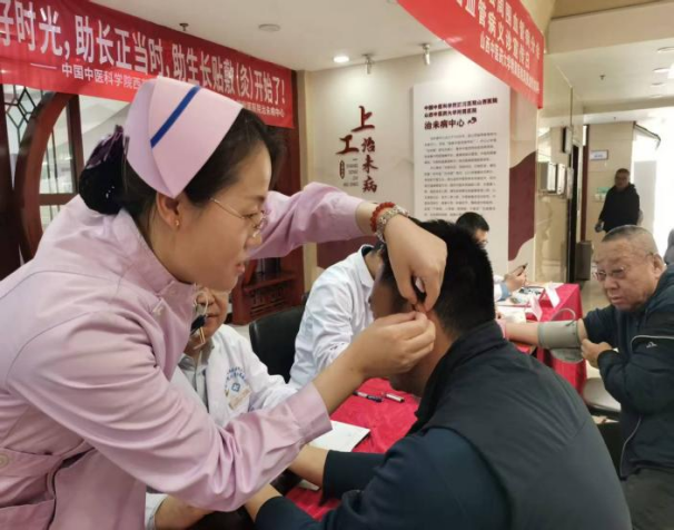 4月16日上午,由党员专家组成的周围血管病诊疗团队在门诊楼一层大厅开展义诊,专家们细致问诊、辨证施治,详细地解答每一位患者提出的问题,并提供个性化诊疗方案;护理团队为患者测量血压、血糖,进行周围血管及神经功能评估,并开展耳穴压豆、中药化腐清创等中医特色治疗。