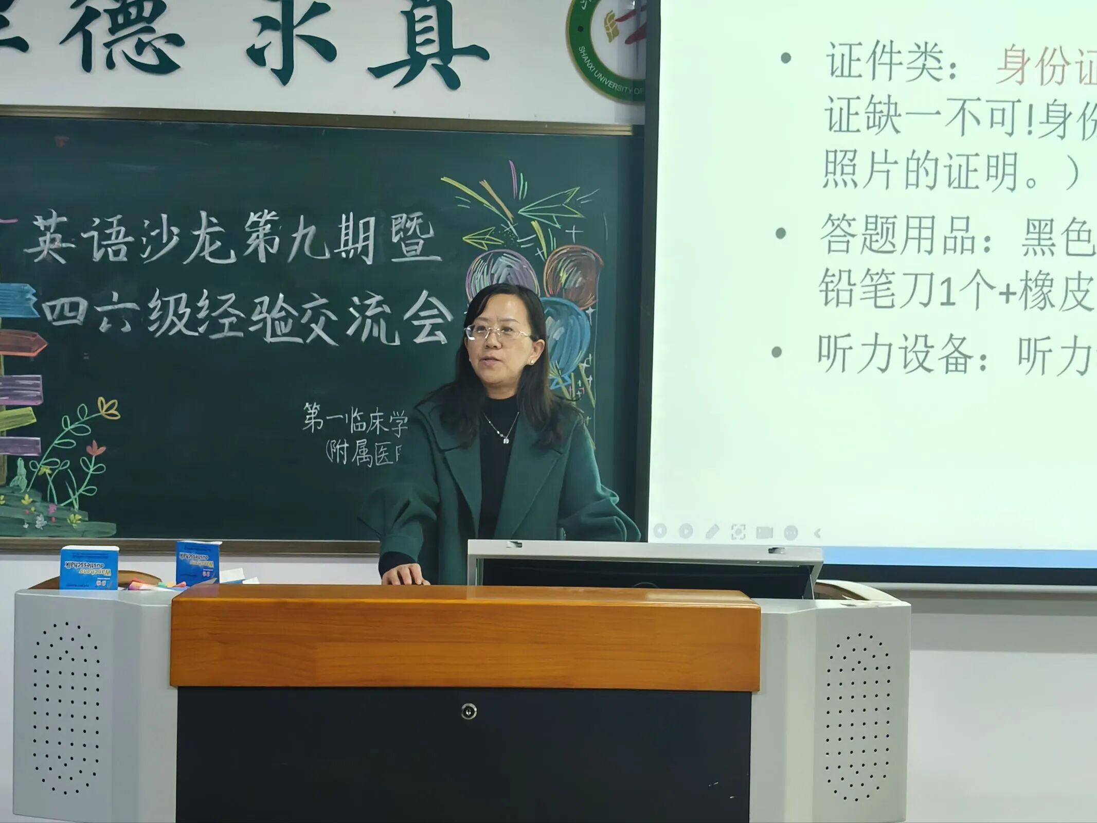 本次活动特别邀请到崔素花老师、陈志斌老师莅临指导,同时还邀请了四六级考试成绩优异的学生代表——23级中医4班李雨霏、23级中医4班廖妮萍、22级中医定向班郭思雨现场分享。她们倾囊相授备考技巧与实战经验,精准解答同学们的共性疑问,助力大家高效提升学习能力,为四六级顺利通关保驾护航。