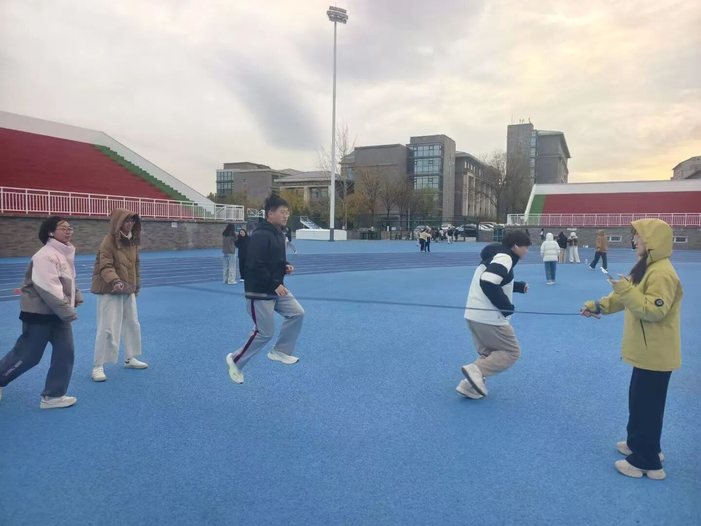 绳影在赛场翻飞,学生们闻声而动,脚步与绳圈精准契合。起落间,默契在眼神中传递,每一次同步跳跃,都似在续写“一二·九”精神里的团结力量。
