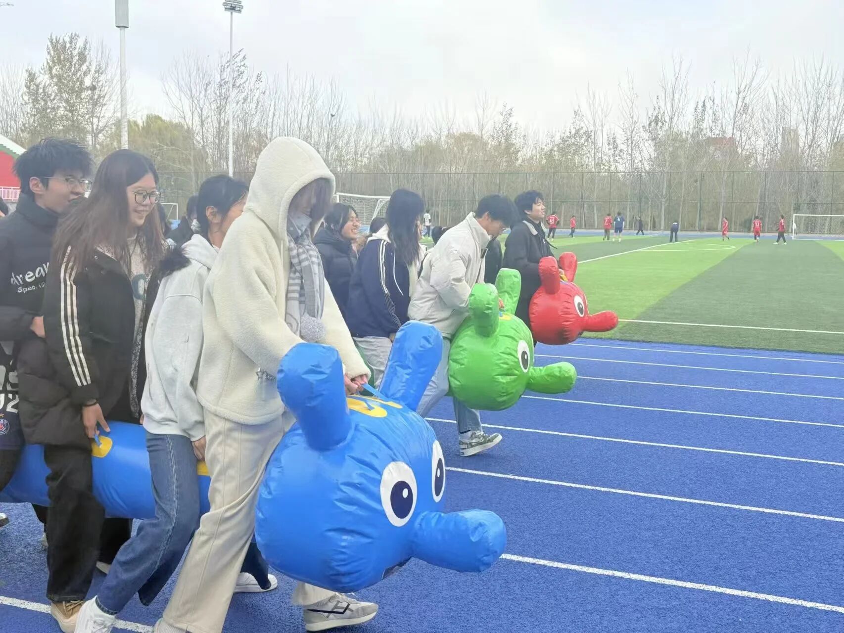学生们同乘“毛毛虫”道具,喊着统一号子发力。步伐从错落到整齐,力量从分散到凝聚,朝着终点稳步迈进,用行动诠释“拧成一股绳”的奋斗精神。